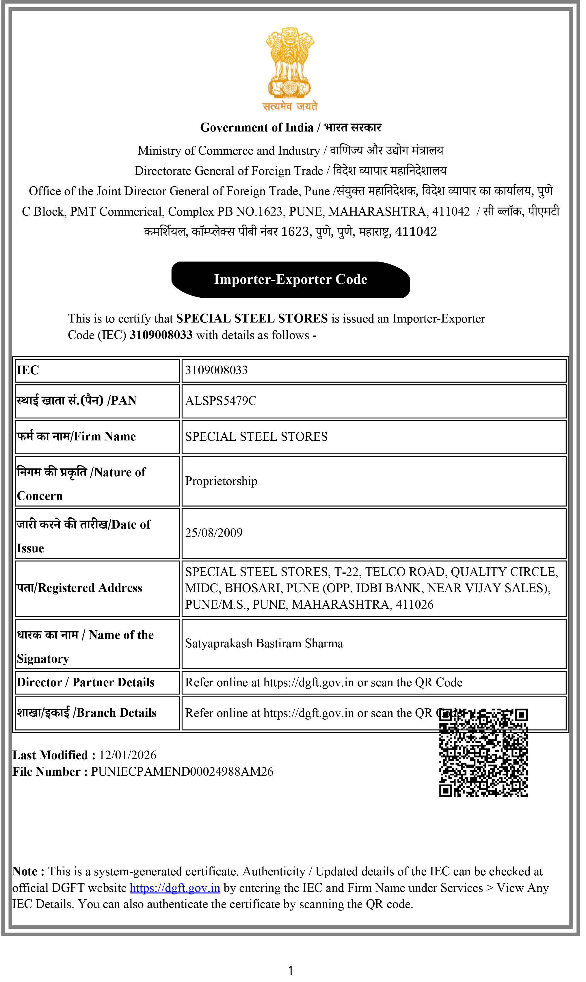 Special Steel Stores is a duly registered Importer and Exporter with the Government of India, holding a valid Import Export Code (IEC) since 2009. This authorization enables the company to lawfully undertake international trade and reflects long-standing compliance with applicable statutory and regulatory requirements. The IEC certification positions Special Steel Stores to engage with domestic and global partners in the sourcing and supply of steel raw materials, with a clear focus on regulatory adherence, operational transparency, and long-term professional collaboration.